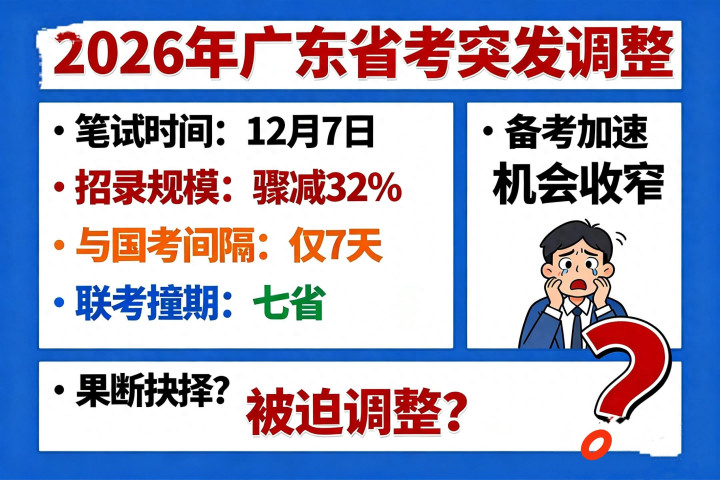 一石激起千层浪!2026年广东省考笔试时间罕见提前至12月7日,招录规模骤减32%,更与国考仅隔7天,与七省“撞期”联考。这突如其来的“三重暴击”,瞬间引爆百万考生圈。备考时钟被强行拨快,机会大门却猛然收窄,巨变之下,你是果断抉择还是被迫调整?